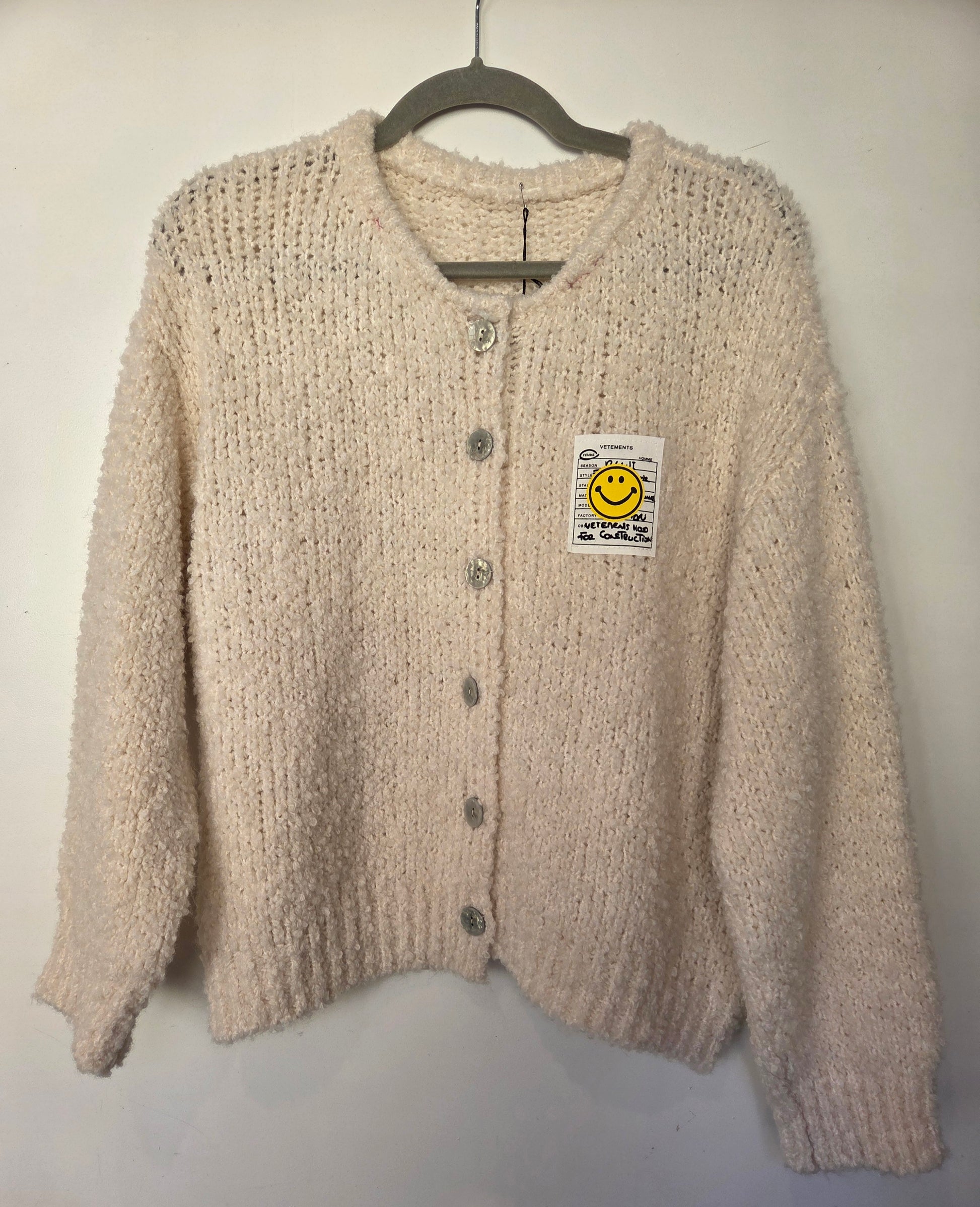 Trendiger Bouclé Cardigan mit Smiley-Patch in Creme.