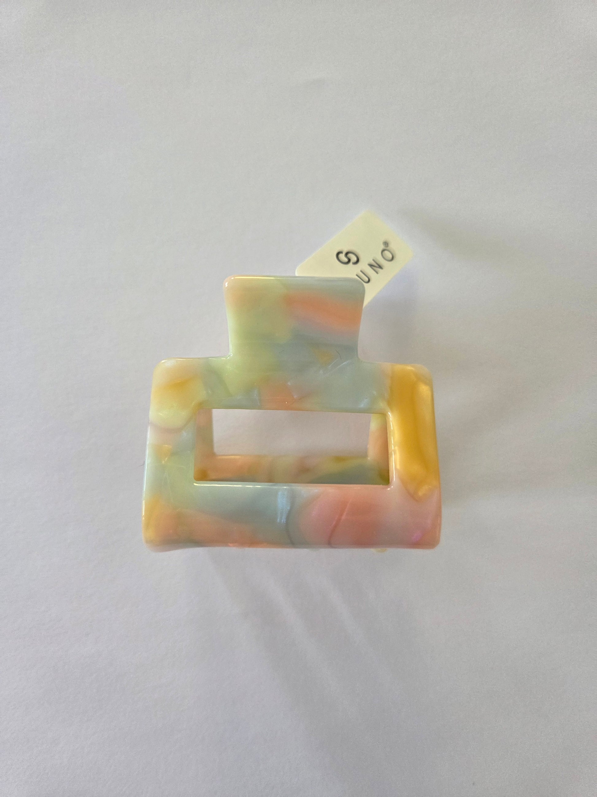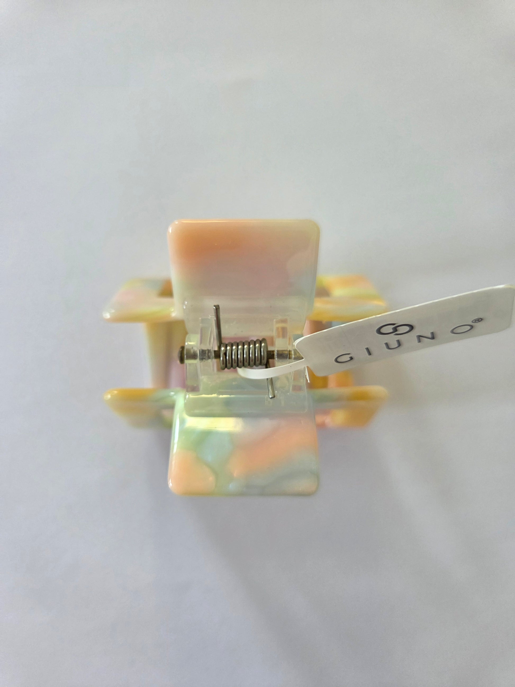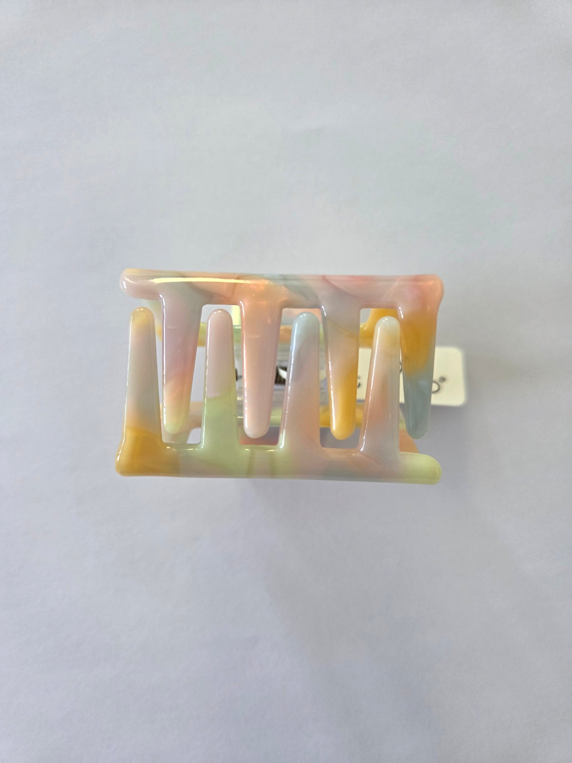 Trendiger Look für tolle Frisuren! Rechteckige Haarklammer mit festem halt, aus Acryl in Creme mit Pastelfarbenen Details.