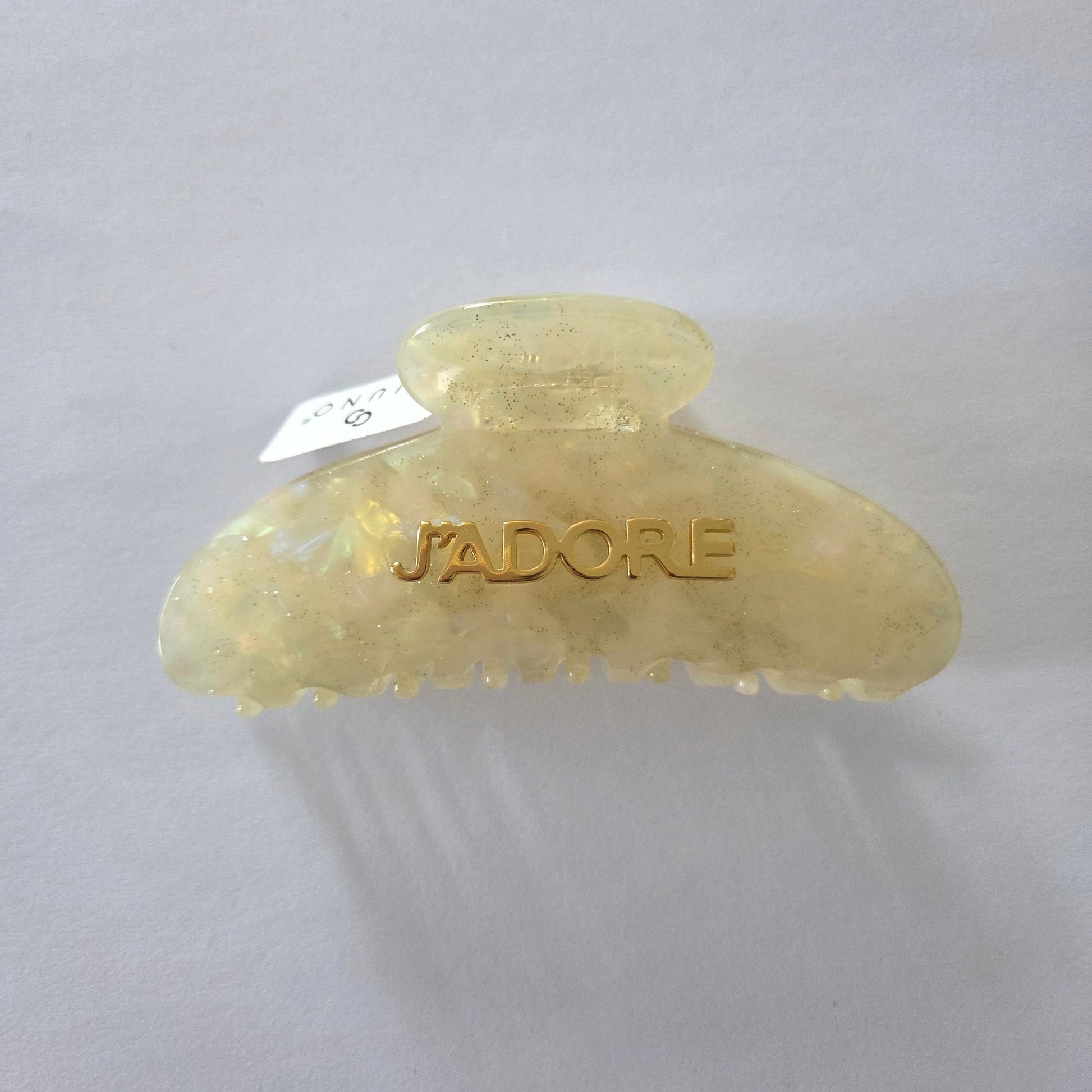 Trendiger Look für tolle Frisuren! Große Haarklammer J'ADORE mit festem halt, aus Acryl sowie Glitzer-Optik in Creme.