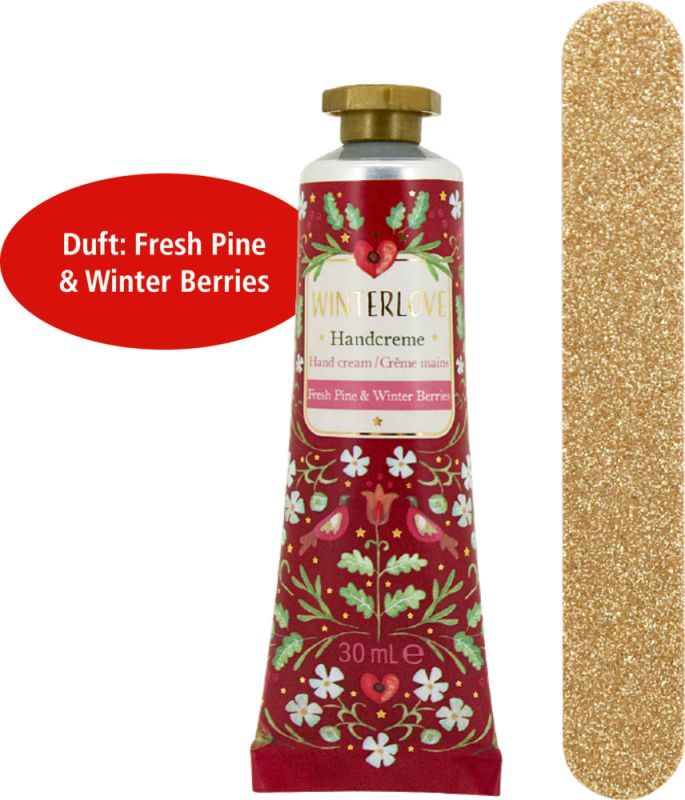Die Handcreme mit 30 ml pflegt mit dem winterlichen Duft von Fresh Pine & Winter Berries, während die Nagelfeile für schöne Nägel sorgt.