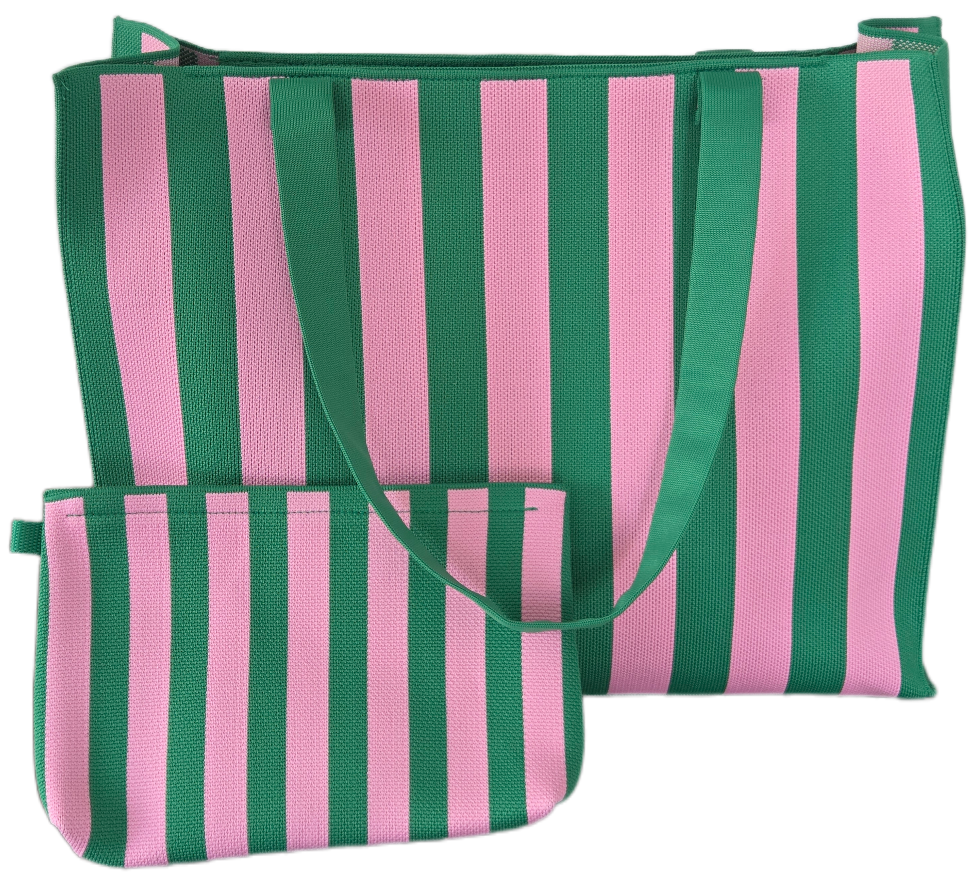 Stylische Tasche/Shopper mit passender Pochette. Im angesagten Streifen Look, Rosa und Grün. Absoluter Eyecatcher – egal ob am Strand, beim Shopping oder auf Reisen.