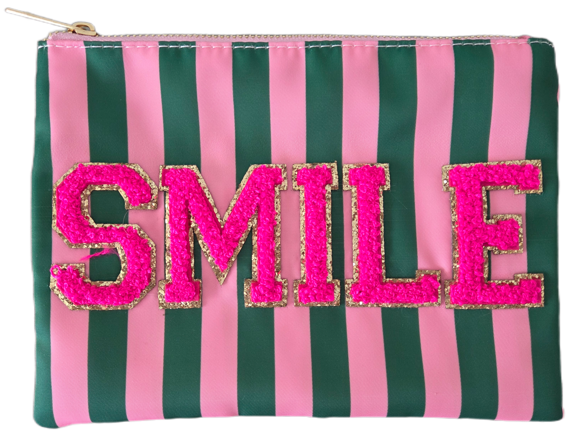 Kosmetiktäschchen mit Reißverschluss. Design: Streifen in rosa und grün mit aufgenähten SMILE-Patches in Neon pink aus Chenille-Glitzer.